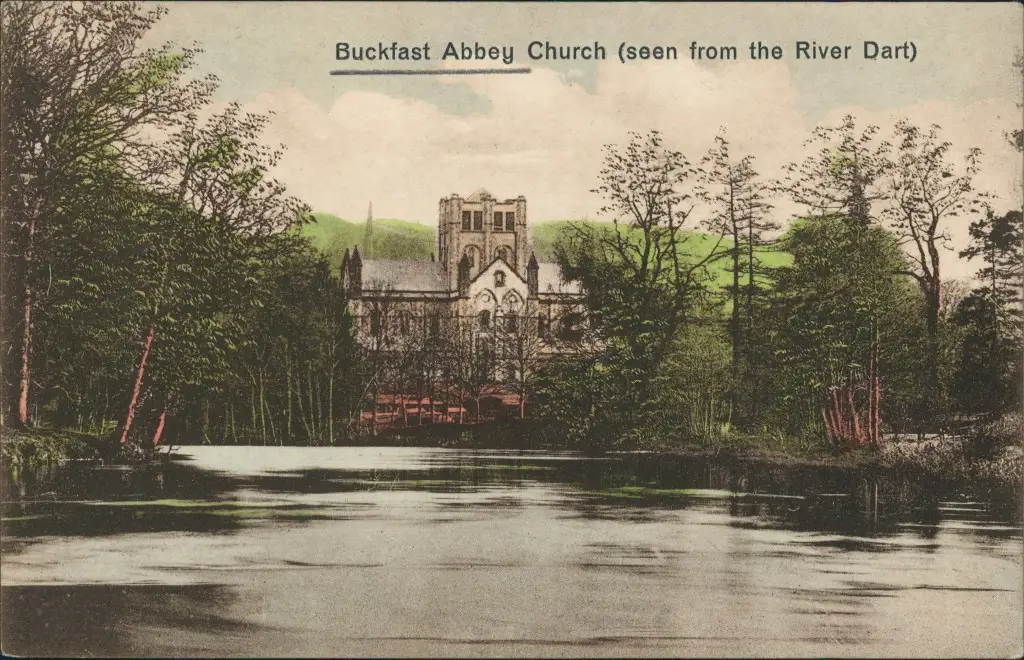 Postcard Buckfastleigh Abbey Church from River (Fluss) Dart 1910
