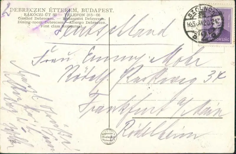 Postcard Budapest Rakoczi Ut 88 Restaurant Debreczen 1924