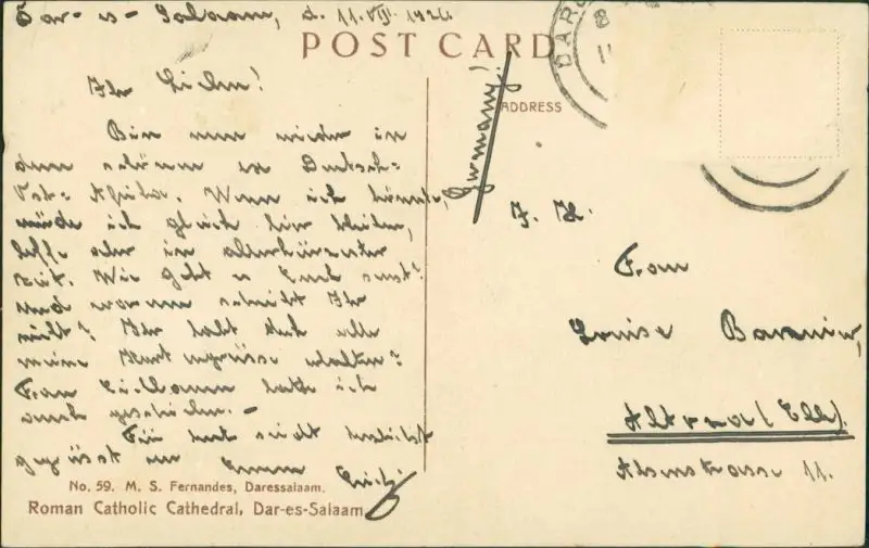 Postcard Daressalam Roman Catholic Cathedral 1924