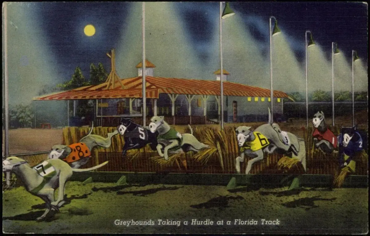 Postcard Florida Greyhounds Taking a Hurdle at a Florida Track 1934