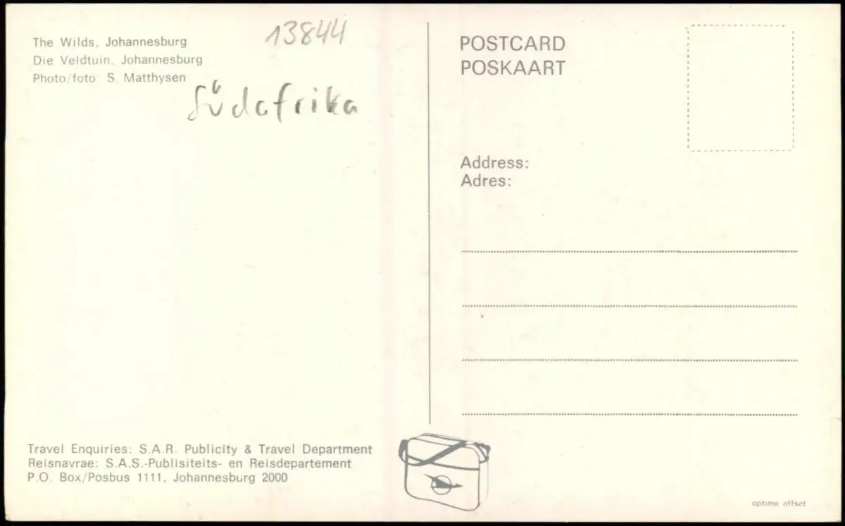 Postcard Johannesburg The Wilds. 1978