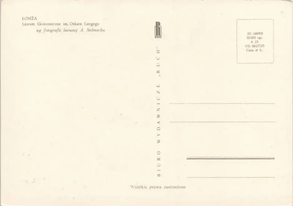 Postcard Lomscha Łomża Liceum Ekonomiczne im. Oskara Langego 1972