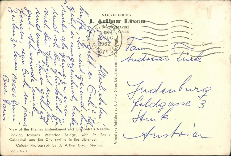 Postcard London Thames Bridge Brücke, Embankment Cleopatra Needle 1962