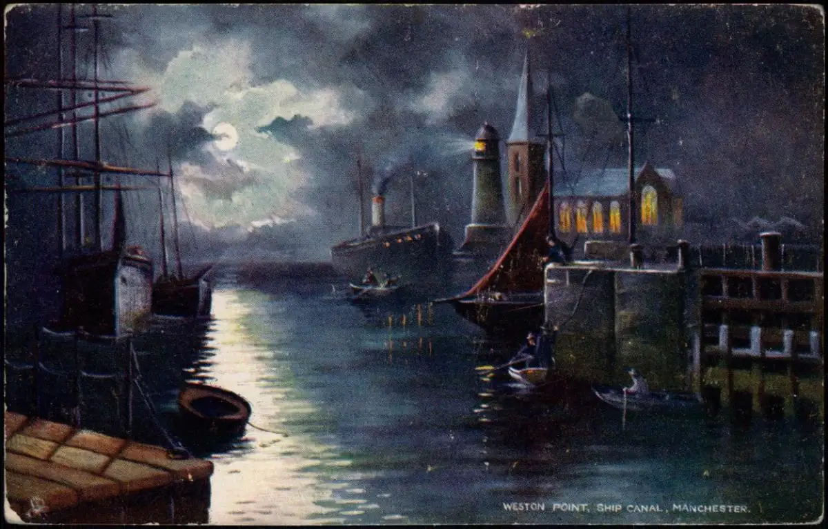 Postcard Manchester Weston Point Ship Canal by Night Mondschein 1912