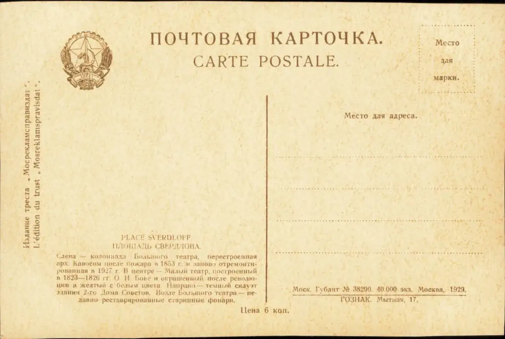 Postcard Moskau Москва́ PLACE SVERDLOFF 1929