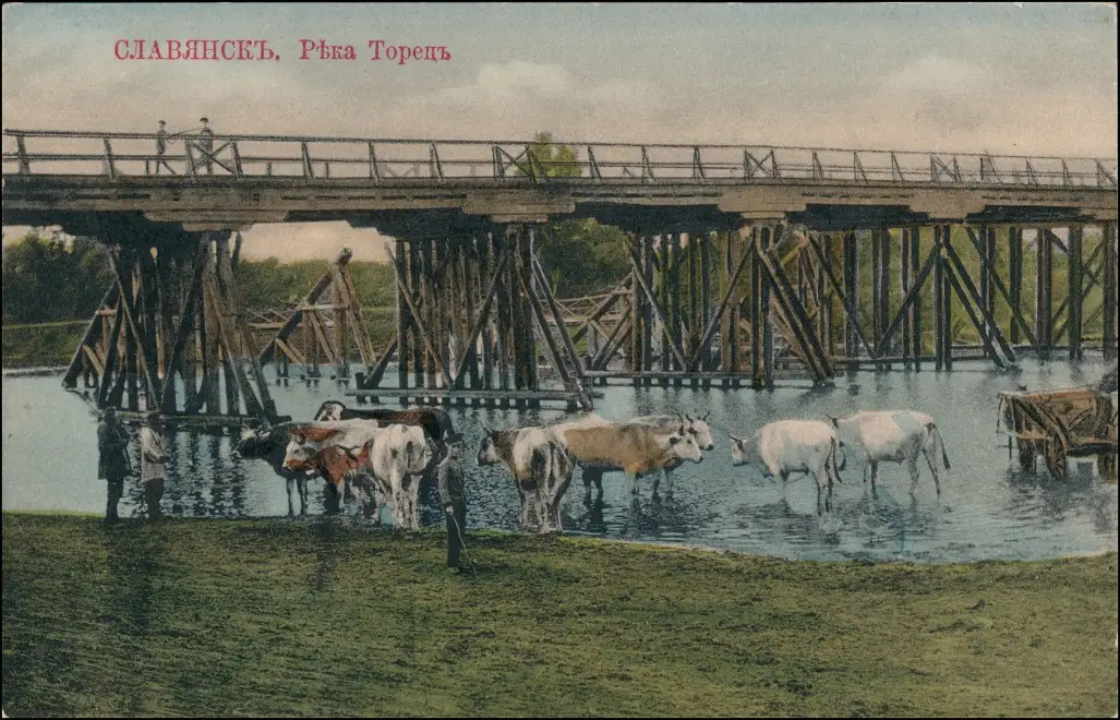 Postcard Slowjansk Слов'янськ Славянс Brücke Kühe 1913