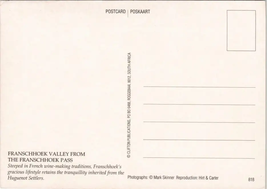 Postcard Südafrika FRANSCHHOEK VALLEY FROM THE FRANSCHHOEK PASS 1980