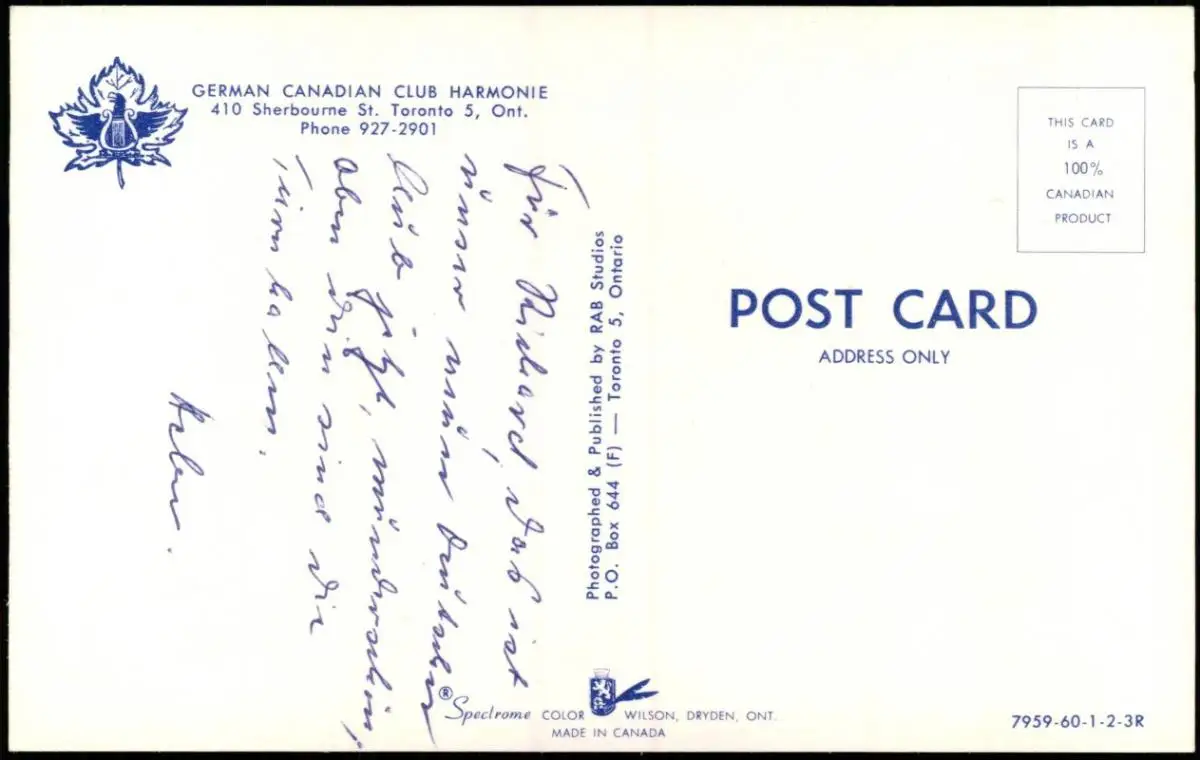 Postcard Toronto GERMAN CANADIAN CLUB HARMONIE 410 Sherbourne 1960