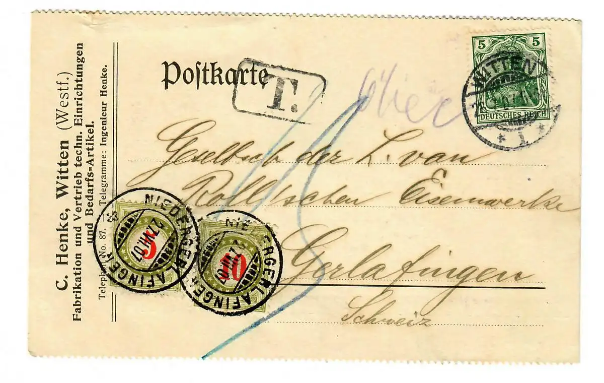 Postkarte 1907 Witten nach Gerlafingen, Taxe