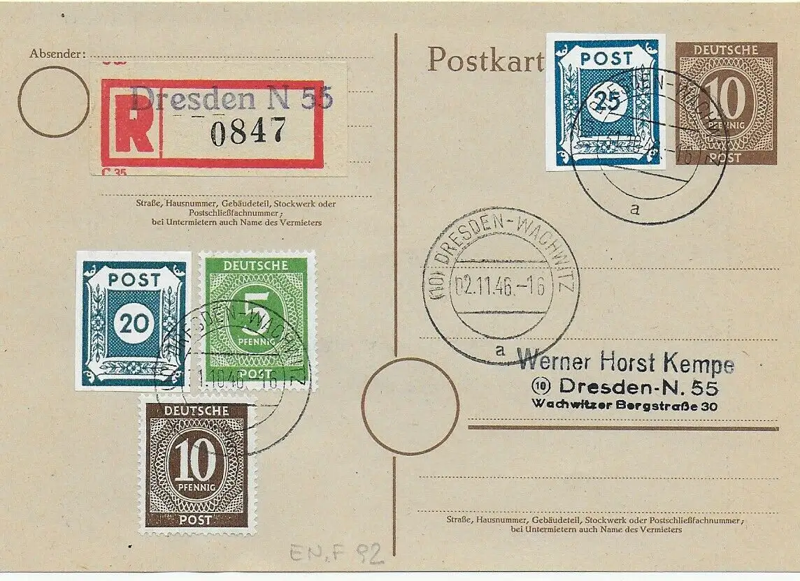Postkarte Einschreiben Dresden 1946, MiF SBZ und All. Bes.