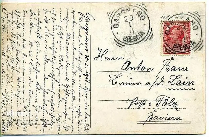 Postkarte - Italien gelaufen, frankiert, 1911, kl. Format, col., I-II, (Eck. Best.) Maße:14 x 9 cm, gute Erhaltung