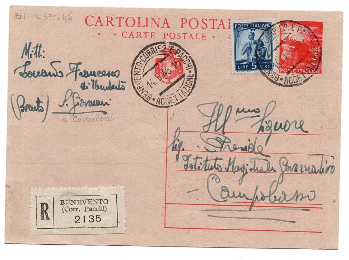 Postkarte - Postkarte Lire 3 rot Demokratisch (Filagrano Nr. C 128) Einschreiben gereist am 14.9.46 mit Zusatzfrankatur von Lire 5 - sehr guter Erhaltungszustand und scharfe Annullierung - Selten Cod. 3230/WEB