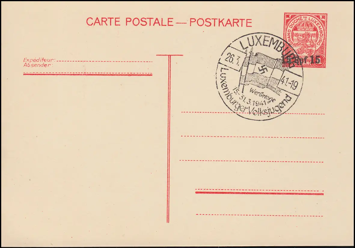 Postkarte Luxemburg mit Aufdruck 15 Rpf SSt Luxemburgische Volksjugend 26.3.41