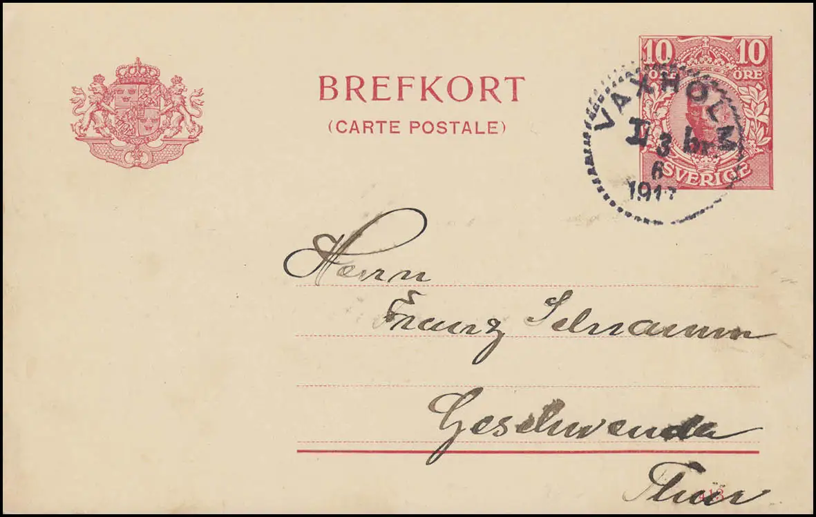 Postkarte P 30 BREFKORT 10 Öre Druckdatum 413, VAXKOLM 3.6.17