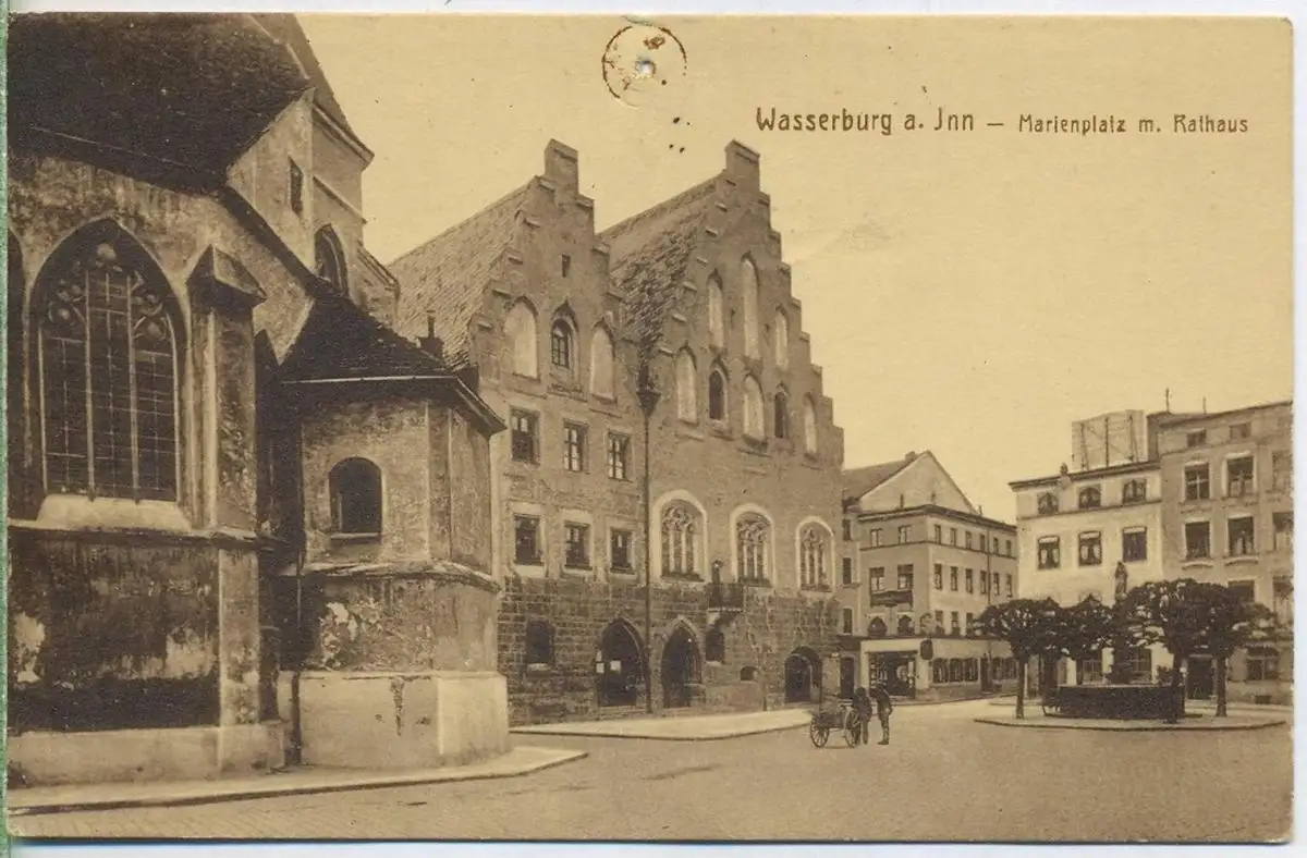 Postkarte: Wasserburg a. Inn, Marienplatz m. Rathaus, gelaufen, kl. Format, s/w , I-II, (Eck. Best.) 1x Loch durch Reißzwecke,