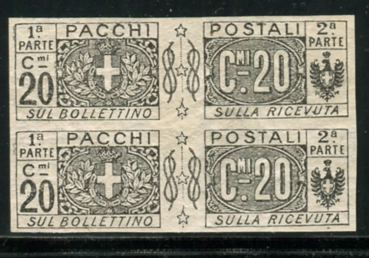 Postpakete Cent. 20 ungezähnte vertikale Paar mit Linguella-Spur - Cent-Postpakete. 20 grau schwarz Nr. 9f ungezahntes vertikales Drehmoment - Ungewöhnlich - Kat. euro 440 Code 161/8