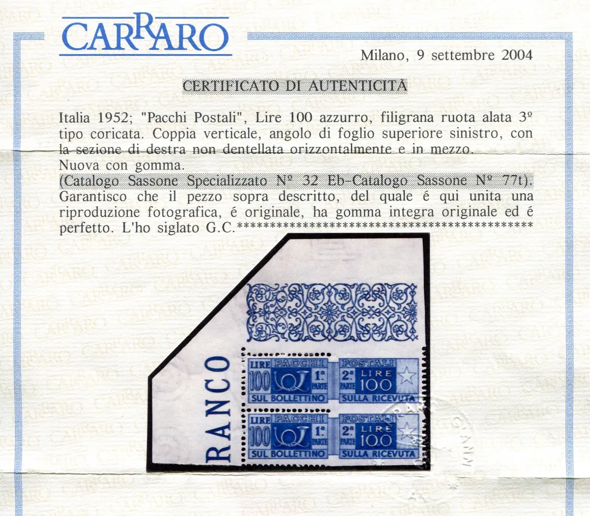 Postpakete Lire 100 Sortenpaar **/* - Postpakete Lire 100 Nr. 77t wunderschönes vertikales Drehmoment a. von f. mit ungezahntem rechten Querschnitt horizontal und in der Mitte (Sächsische Spez. n. 32Eb) - Selten - Zert. G. Carraro - Kat. 2.500 Code Nr. 784/2