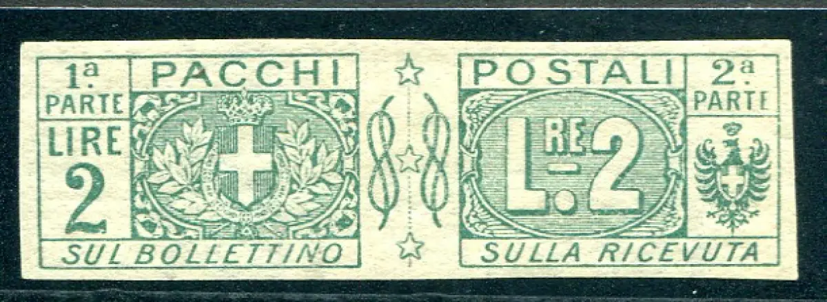 Postpakete Lire 2 grün Nr. 13f ungezähnte Linguella-Spur - Postpakete Lire 2 grün Nr. 13f ungezähnt - Ungewöhnlich - Kat. € 220 Code 163/8