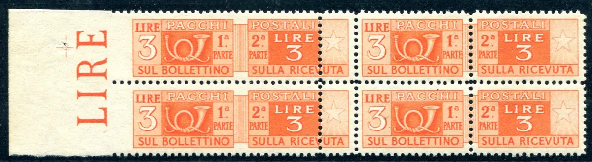 Vollgummi - Postpakete Lire 3 Nr. 70/I Quartina mit den beiden linken Marken ungezähnt links, mit stark nach rechts verschobener vertikaler Verzahnung (Sächsische Spez. n. 18Eh) - Ungewöhnlicher Code Nr. 763/2