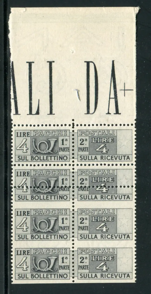 Postpakete Lire 4 Streifen Sorte Vollgummi - Postpakete Lire 4 Nr. 71/Der vertikale Streifen von vier b. von f.; das zweite Exemplar mit stark nach oben verschobener unterer Verzahnung (Nr. 71/Iaab), das dritte und vierte sind waagerecht ungezähnt (Nr. 71/ie) - Selten - Kat. euro 330 Code 757/8