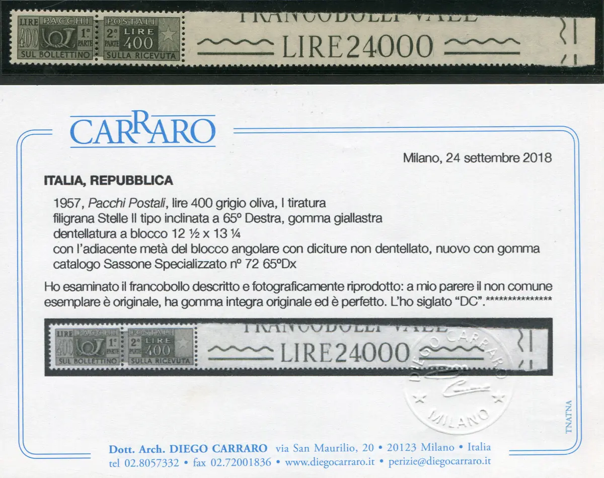 Postpakete Lire 400 Sterne II auf Position 65. DX Vollgummi - MHN - - Postpakete 400 Lire Nr. 97 / Die filigranen Sterne II in Position 65. DX, gelblicher Gummi (Sass. spec. Nr. 72) - sehr gutes Exemplar b. von f. (aus ungelochtem Eckblock) - Selten - Kat. 1.250 - Cert. D. Carraro Cod. 949/14