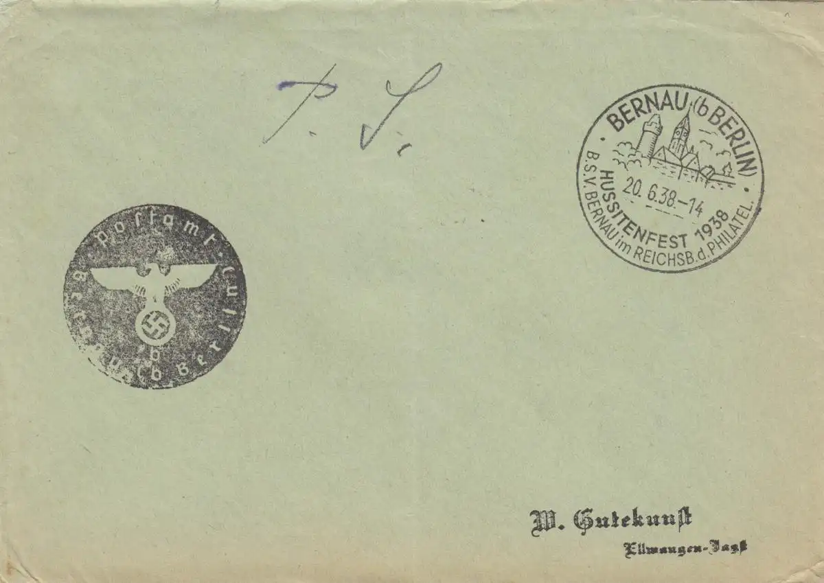 Postsache Kuvert 1938: Bernau bei Berlin, Hussitenfest