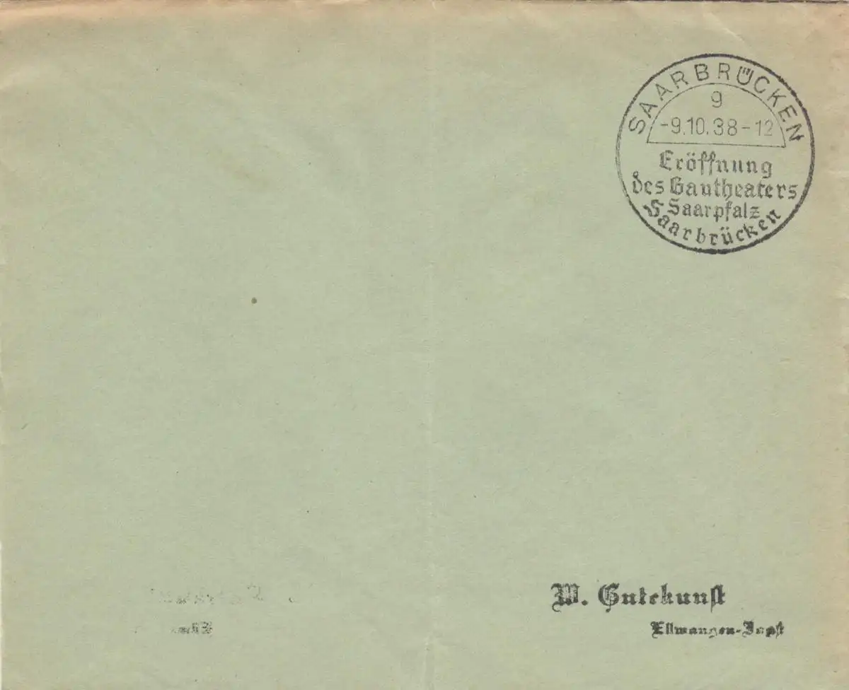 Postsache Kuvert 1938: Saarbrücken: Eröffnung Gautheater Saarpfalz