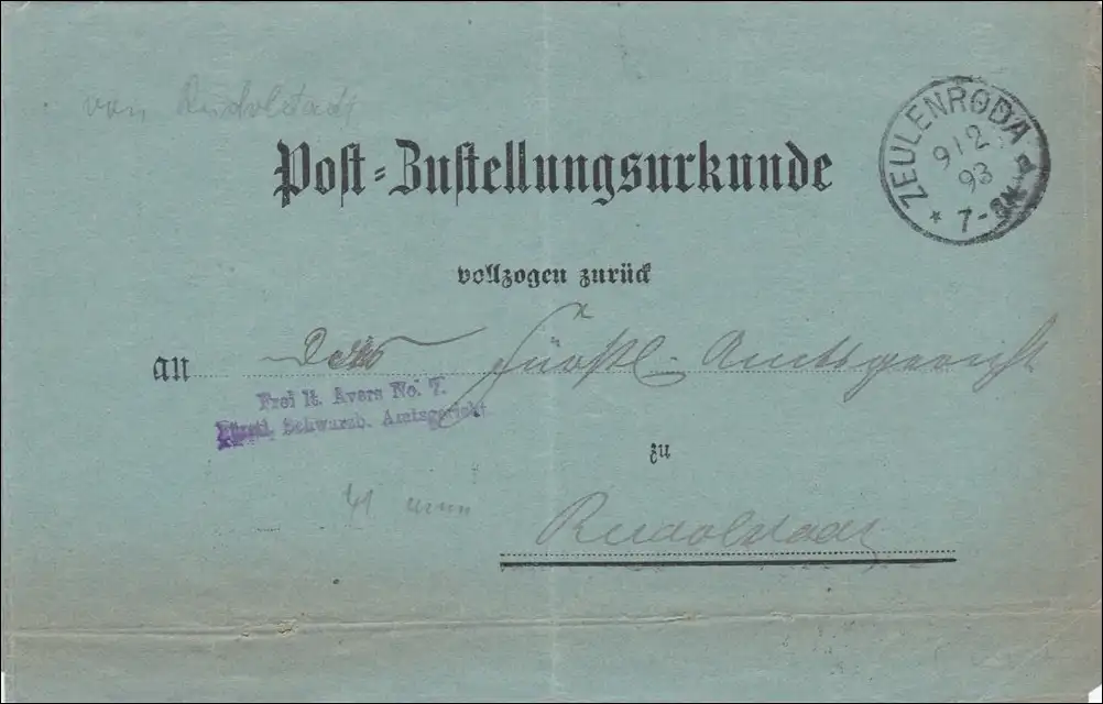 Postzustellurkunde Zeulenroda nach Rudolstadt 1893