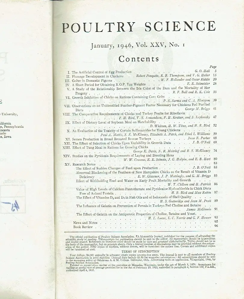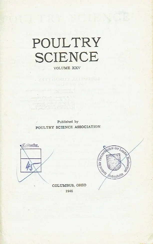 guter Zustand, Gebrauchs- und Alterungsspuren: ehemaliges Bibliotheksexemplar, Vorsatz und Titel mit je 2 Stempeln und Nummern - Seitenschnitt gebräunt / vergilbt und teils leicht fleckig- Seiten sauber und ordentlich - leicht unfrischer Geruch - untere Einbandecken etwas gestaucht, dadurch auch Seiten teils etwas eselsohrig, erschien aller 2 Monate, Buch enthält alle 6 Ausgaben des Jahres 1946 als Beispiel für den Inhalt der des ersten Heftes: - The Artificial Control of Egg Production    G. O. Hall - Plumage Development in Chickens    Robert Penquite, R. B. Thompson, and V. G. Heller - Goiter in Domestic Pigeons    W. F. Hollander and Oscar Riddle - A Short Period for Obtaining R.O.P. Egg Weights E. E. Schnetzler - A Study of the Relationship Between the Iris Color of the Dam and the Mortality of Her Progeny      R. F. Ball and R. K. Cole - Growth Inhibition of Chicks on Rations Containing Corn Grits    P. S. Sarma and C. A. Elvehjem - Observations on an Unidentified Feather-Pigment Factor Necessary for Chickens Fed Purified Diets    George M. Briggs - The Comparative Requirements of Chicks and Turkey Poults for Riboflavin    F. H. Bird, V. S. Asmundson, F. H. Kratzer, and S. Lepkovsky - Effect of Dietary Level of Soybean Meal on Hatchability    D. Whitson, H. W. Titus, and H. R. Bird - An Evaluation of the Toxicity of Certain Sulfonamides for Young Chickens    Paul A. Mattis, S. E. McKinney, Elizabeth A. Patch, and Ethel L. Williams - Semen Production in Broad Breasted Bronze Turkeys Jesse E. Parker - The Effect of Selection of Chicks Upon Variability in Growth Data J. B. O'Neil - Effect of Tung Meal in Rations for Growing Chicks     George K. Davis, N. R. Mehrhof and R. S. McKinney - Studies on the Pyridoxin Requirements of Laying and Breeding Hens    W. W. Cravens, E. E. Sebesta, J. G. Halpin, and E. B. Hart - Research Notes - The Effect of Sudden Changes of Feed upon Production J. B. O'Neil - Abnormal Blackening of the Feathers of New Hampshire Chicks as the Result of Vitamin D Deficiency    E W Glazener, J. P. Mattingly, and G. M. Briggs - Effect of Withholding Feed and Water on Early Poult Mortality and Growth W. T. Chilson and H. Patrick - Value of High Levels of Calcium Pantothenate and Pyridoxine Hydrochloride in Chick Diets Free of Animal Protein    H R  Bird and Max Rubin - The Effect of Vitamins D2 and D3 in Fish Oils and of lodocasein of Shell Quality H. S. Gutteridge and Jean M. Pratt - The Influence of Gelatin on Prevention of Perosis in Turkeys Fed Choline and Betaine James McGinnis - The Effect of Gelatin on the Antiperotic Properties of Choline, Betaine and Yeast H. L. Lucas, L. C. Norris and G. F. Heuser - News and Notes - Book Review, Leinen, ca. 17 x 26, 656 Seiten mit einigen Bildern und Diagrammen