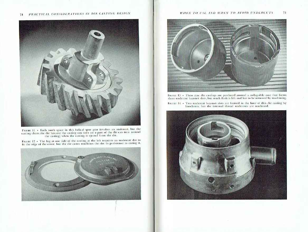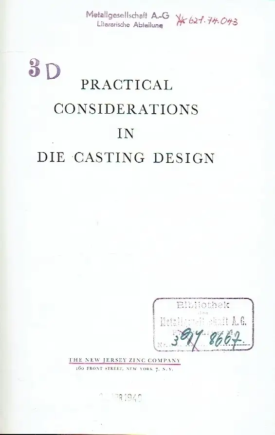 guter Zustand, Gebrauchs- und Alterungsspuren: ehemaliges Bibliotheksexemplar - Titel mit Stempeln und Notizen - Deckel innen mit angeklebtem Papierrest - Vorsatz und Schmutztitel mit weiteren Stempeln - Seiten aber sauber und ordentlich - Einband unten rechts unten links vom Rücken teils etwas aufgeraut / beschabt, General Considerations In The Design Of Die Castings - Section Thickness - Where Intricacy Is An Asset - Ribs, Fins, Beads And Bosses Add to Utility Of Die Castings - Cores Are Assets In Die Casting - When To Use And When To Avoid Undercuts - Fillets And Edges - Wheels, Gears And Cams - Where And Why Die Cast Threads Are Used - Fastening Expedients - Inserts In Relation To Die Casting Design - How Design Affects Flash Removal Costs - Piercing And Forming Possibilities - How Design Influences Polishing Costs - Appearance Factors, Including Decorative Features And Lettering - Bibliography - Index, Leinen, ca. 15,5 x 23, 246 Seiten mit zahlreichen Bildern