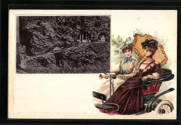 Präge-AK Aescher b. Wildkirchli, Ortsansicht mit Damen in der Kutsche