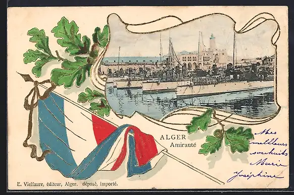 Präge-AK Alger, Amirauté, Passepartout mit Flagge und geprägtem Goldrahmen