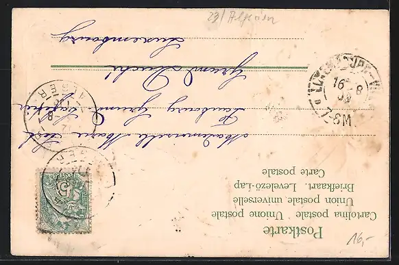 Personenbezogene Daten auf der Rückseite der Karte wurden durch blauen Textmarker unkenntlich gemacht. Die blauen Stellen sind auf die Vorderseite durchgeweicht und wirken sich negativ auf das Postkartenfoto aus