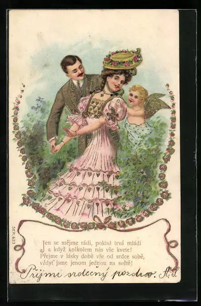 Präge-AK Amor hinter jungem eleganten Paar