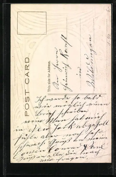 Personenbezogene Daten auf der Rückseite der Karte wurden durch blauen Textmarker unkenntlich gemacht. Die blauen Stellen sind auf die Vorderseite durchgeweicht und wirken sich negativ auf das Postkartenfoto aus