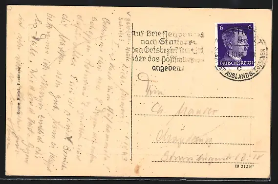 Personenbezogene Daten auf der Rückseite der Karte wurden durch blauen Textmarker unkenntlich gemacht. Die blauen Stellen sind auf die Vorderseite durchgeweicht und wirken sich negativ auf das Postkartenfoto aus