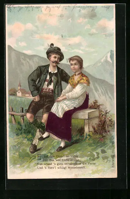 Präge-AK Bayerisches Liebespaar auf einer Bank