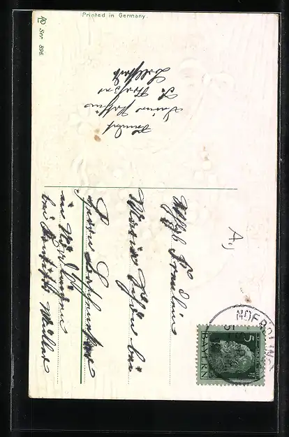 Personenbezogene Daten auf der Rückseite der Karte wurden durch blauen Textmarker unkenntlich gemacht. Die blauen Stellen sind auf die Vorderseite durchgeweicht und wirken sich negativ auf das Postkartenfoto aus