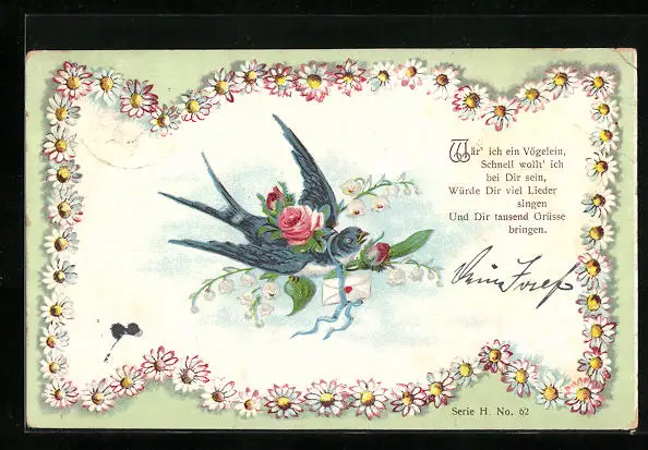 Präge-AK Briefschwalbe mit Maiglöckchen