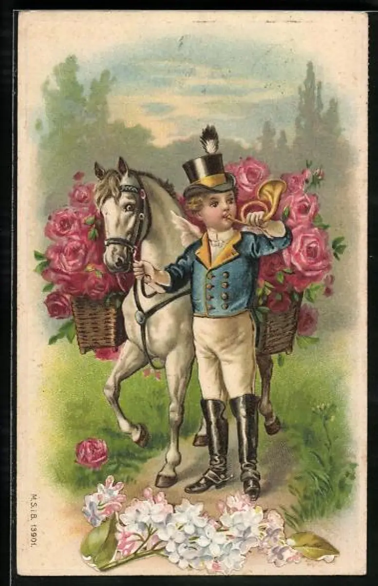 Präge-AK Briefträger und Pferd mit Rosenkorb