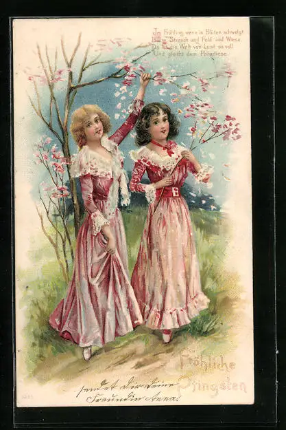 Präge-AK Damen in langen Kleidern zu Pfingsten