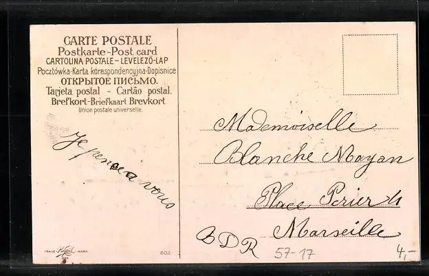 Personenbezogene Daten auf der Rückseite der Karte wurden durch blauen Textmarker unkenntlich gemacht. Die blauen Stellen sind auf die Vorderseite durchgeweicht und wirken sich negativ auf das Postkartenfoto aus