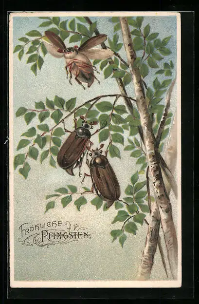 Präge-AK Drei Maikäfer an einer Birke, Pfingstgruss