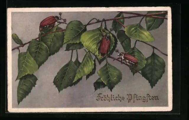 Präge-AK Drei Maikäfer auf einem Zweig, Pfingstgruss