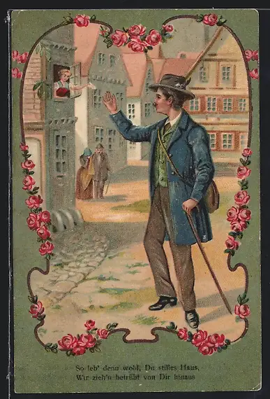 Präge-AK Ein Mann nimmt Abschied um weiter zu wandern