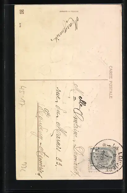 Personenbezogene Daten auf der Rückseite der Karte wurden durch blauen Textmarker unkenntlich gemacht. Die blauen Stellen sind auf die Vorderseite durchgeweicht und wirken sich negativ auf das Postkartenfoto aus