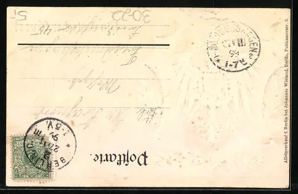 Personenbezogene Daten auf der Rückseite der Karte wurden durch blauen Textmarker unkenntlich gemacht. Die blauen Stellen sind auf die Vorderseite durchgeweicht und wirken sich negativ auf das Postkartenfoto aus