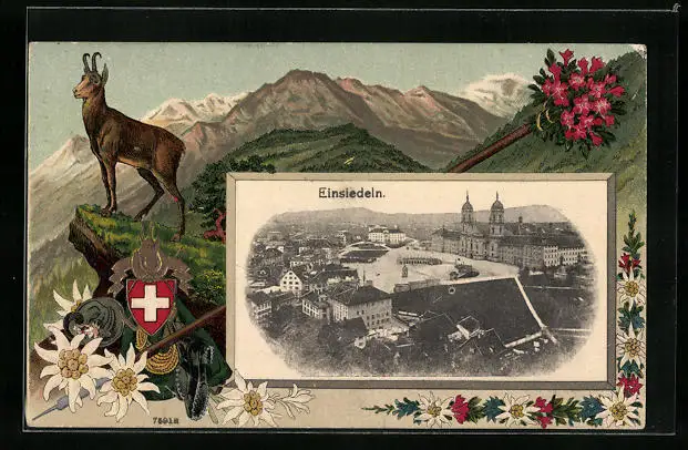 Präge-AK Einsiedeln, Teilansicht mit Kirche, Gämse und Edelweiss