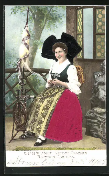 Präge-AK Elsässer Tracht, Frau am Spinnrad
