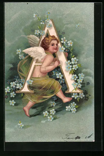 Präge-AK Engel läuft mit Buchstabe A und Vergissmeinnicht-Blüten